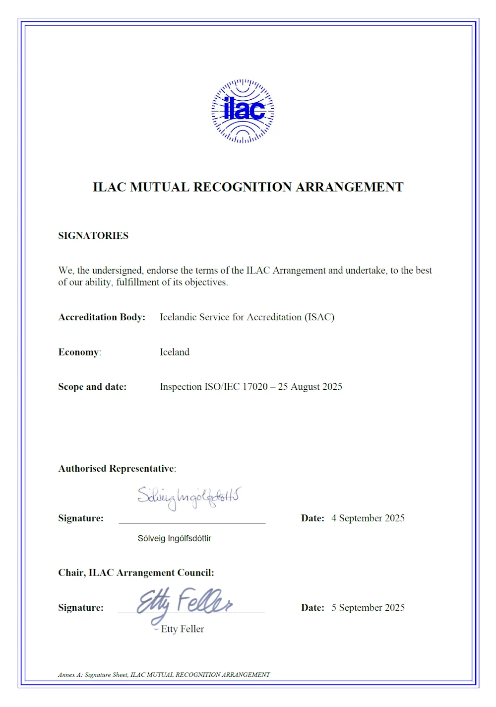 Þann 25. ágúst síðastliðinn hlaut ISAC fulla aðild að alþjóðasamtökunum International Laboratory Accreditation Cooperation (ILAC). Aðildin staðfestir að ISAC uppfyllir alþjóðleg viðmið og kröfur sem gerðar eru til faggildingaraðila og markar mikilvægan áfanga í þróunar faggildingarstarfs á Íslandi. Jafnframt styrki aðildin samkeppnisstöðu íslenskra fyrirtækja og stofnana sem reiða sig á faggildingu í alþjóðlegu umhverfi.
