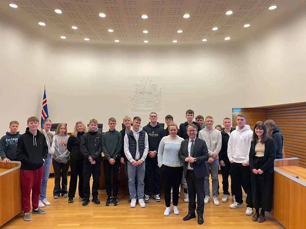 Nemendur úr Fjölbrautaskólanum í Garðabæ ásamt kennara sínum, Tinnu Ösp Arnardóttur, komu í heimsókn í Hæstarétt í vikunni. Benedikt Bogason, forseti Hæstaréttar, og Linda Ramdani, aðstoðarmaður dómara, tóku á móti þeim, kynntu starfsemi réttarins og réttarkerfið.