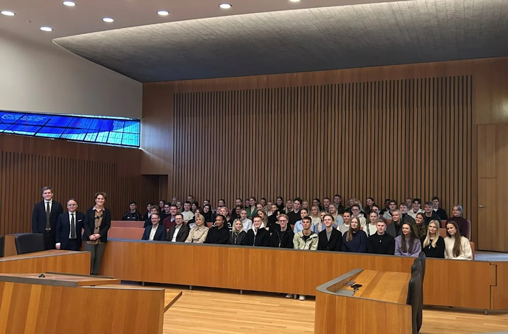 Í dag fékk Hæstiréttur heimsókn frá laganemum á 1. ári í stjórnskipunarrétti við Háskóla Íslands. Með þeim mættu kennarar þeirra Hafsteinn Þór Hauksson dósent og Kári Hólmar Ragnarsson dósent. Á móti gestunum tóku Benedikt Bogason forseti Hæstaréttar, Björg Thorarensen hæstaréttardómari og Guðmundur Snæbjörnsson aðstoðarmaður hæstaréttardómara. Gerðu þau grein fyrir starfsemi réttarins og svöruðu fyrirspurnum. Myndin var tekin við þetta tilefni.