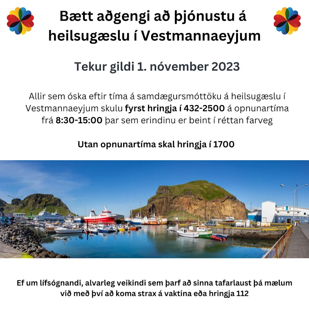 Þann 1. nóvember 2023 tekur í gildi breyting á aðgengi á heilsugæslu í Vestmannaeyjum. Heilbrigðisþjónusta er í stöðugri endurskoðun og mikilvægt að horfa til framtíðar og til þarfa samfélagsins. Með skipulagsbreytingunni er markmiðið fyrst og fremst að beina erindum í réttan farveg, auka framboð bókanlegra tíma, stytta biðtíma og draga úr álagi starfsfólks.