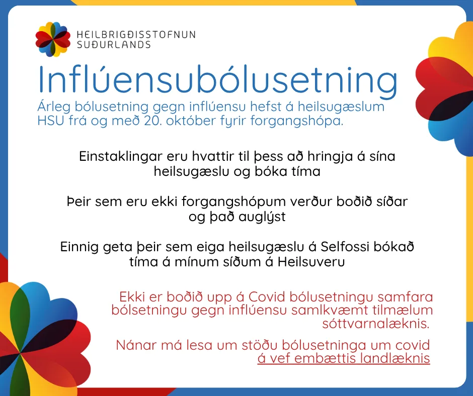 Árleg bólusetning gegn inflúensu hefst á heilsugæslum HSU frá og með 20. október fyrir forgangshópa.