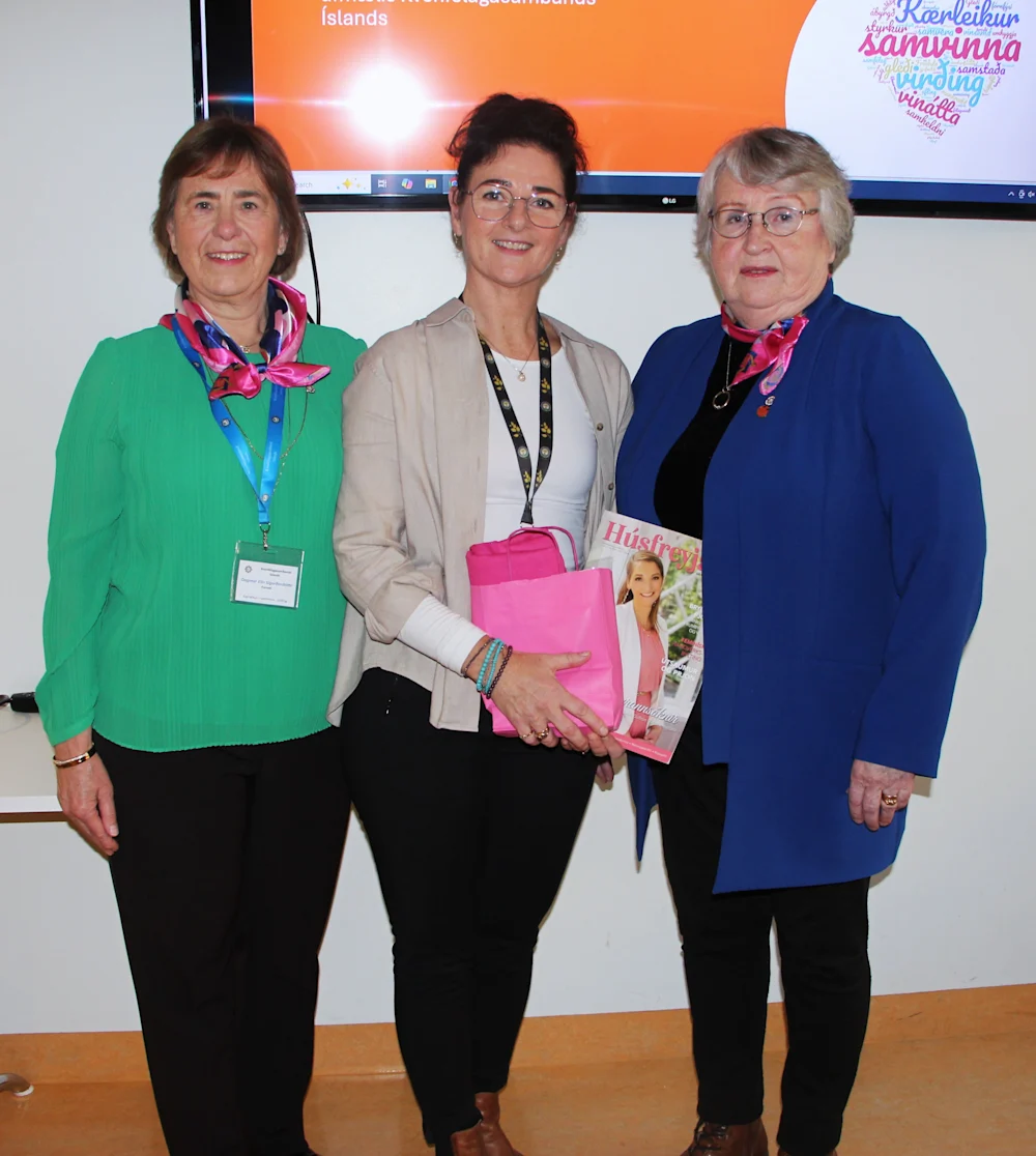 Björk Steindórsdóttir yfirljósmóðir fyrir miðju, ásamt Dagmar Elínu Sigurðardóttur forseta Kvenfélagssambands Íslands til vinstri og Elínborgu Sigurðardóttur sem fór fyrir afmælisnefnd