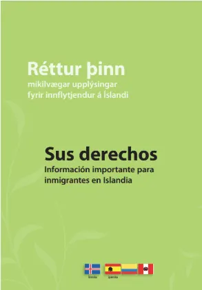 Este folleto contiene información útil referente al sistema legal y la sociedad islandesa así cómo información sobre la igualdad de derechos e igualdad entre géneros, el permiso de residencia, trafico humano, divorcio, asuntos de custodia, asuntos sobre derecho de visita, asuntos financieros, violencia en relaciones personales y amenazas. Aquí también se da información detallada acerca de la asistencia disponible p. ej., direcciones, teléfonos y direcciones electrónicas de varias instituciones y organizaciones.