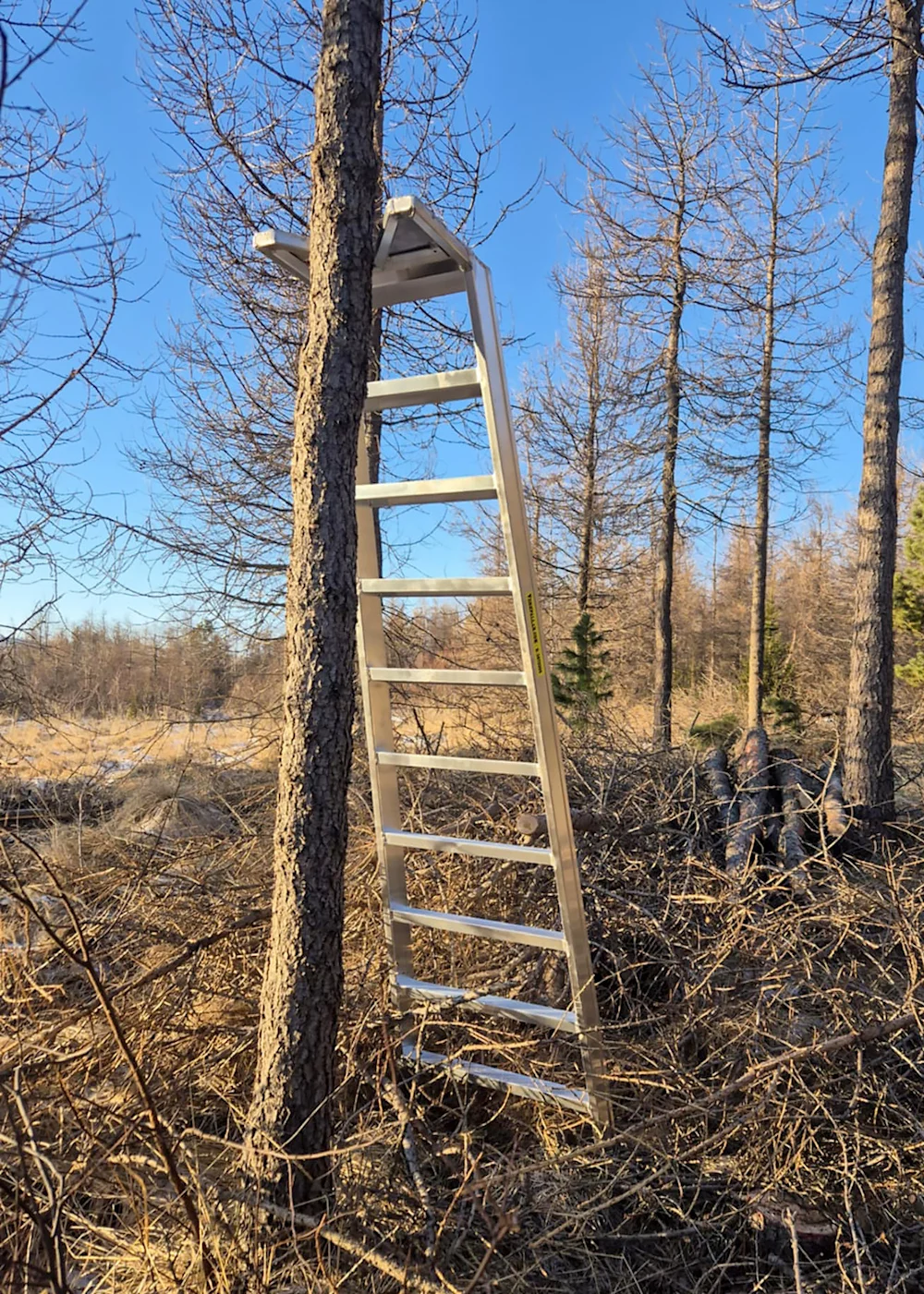 Hér er sérsmíðaður stigi sem nýtist vel til að ná hærra upp í trén við uppkvistun. Þegar markmiðið er að ná sem mestum gæðum og verðmæti úr timbrinu er gott að stefna að uppkvistun bols upp í allt að sex metra hæð í fyllingu tímans. Ljósmynd: Johan Holst.