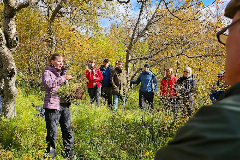 Sólveig fræðir um jarðveg þroskaðs skógar í skoðunarferð sem farin var í tengslum við birkiráðstefnu NordGen í september 2025. Ljósmynd: Pétur Halldórsson