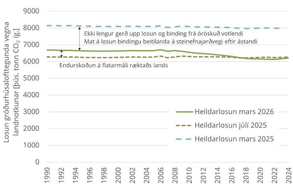 Mynd 2. Samanburður á mati á heildarlosun vegna landnotkunar eftir skilum í mars 2026, júlí 2025 og mars 2025.