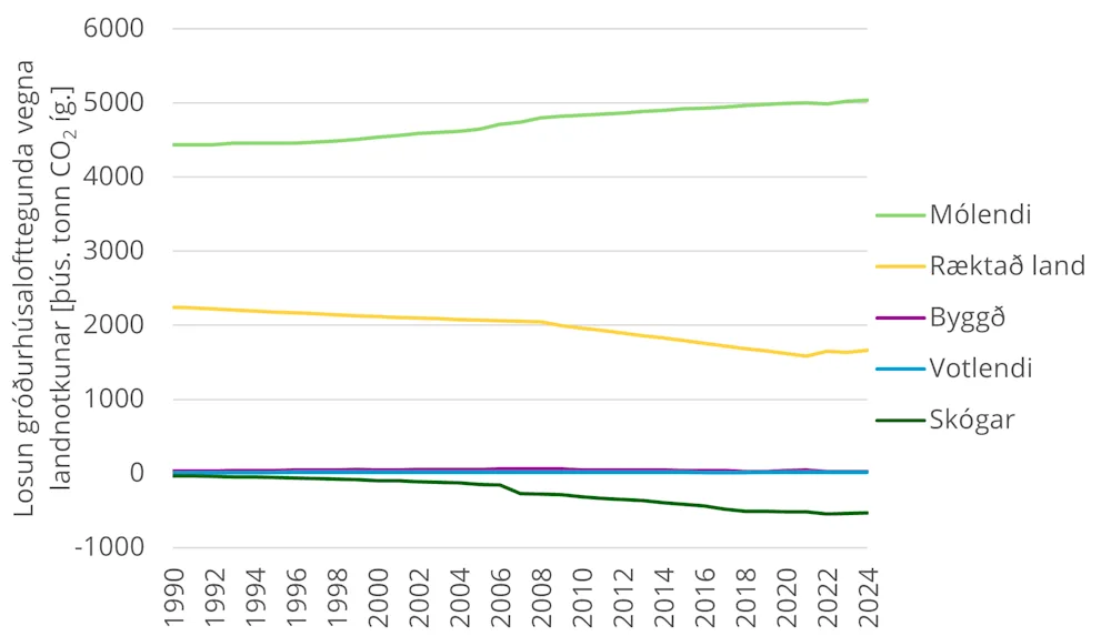 Losun frá landnotkun var 6,2 milljónir tonna CO₂-ígilda árið 2024 og hefur aðeins dregist saman frá 2008, að undanskildum síðustu þremur árum þar sem losun jókst lítillega. Meirihluti losunar frá landnotkun stafar af framræstu votlendi. Losun í hverjum yfirflokki landnotkunar má sjá á mynd 1.