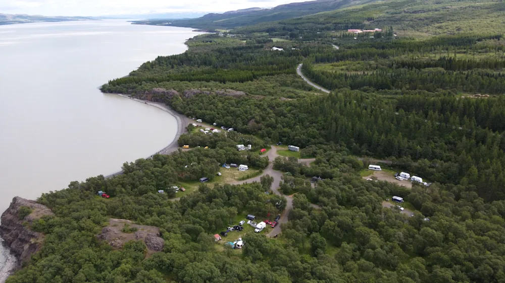 Hin víðkunna Atlavík þar sem löngum voru haldnar útisamkomur en þar er nú vinsælt tjaldsvæði – bóka á parki.is.