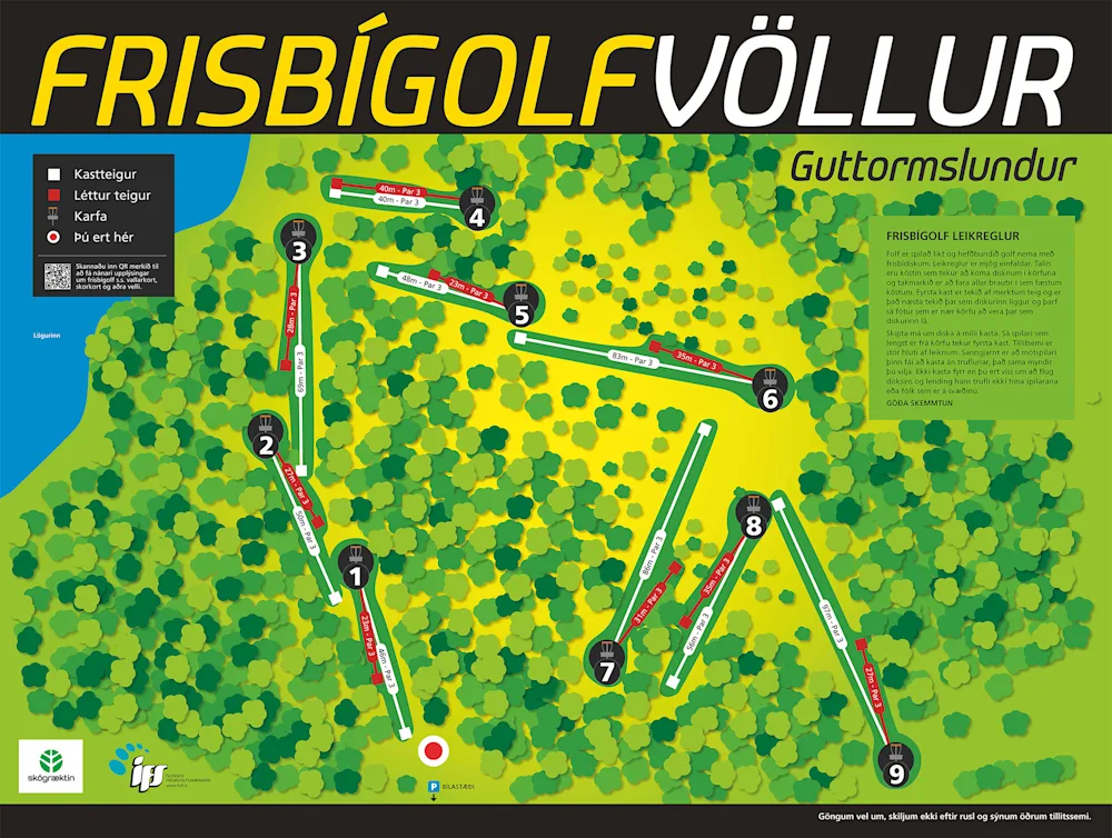 Frisbígolfvöllurinn í Hallormsstaðaskógi nýtur töluverðra vinsælda og hann er að finna á Wikiloc-vefnum þar sem skoða má völlinn betur og afstöðu hans á korti. Hringurinn er rétt rúmlega kílómetri að lengd en fólk sem spilar allan völlinn gengur auðvitað miklu lengri leið samanlagt. Þetta er því góð leið til að njóta lífsins í skóginum.