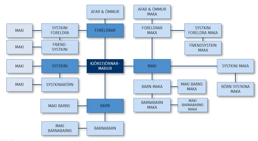 Til skýringar er hér mynd sem sýnir dæmi um vanhæfi. Ef einhver þeirra sem taldir eru upp á myndinni eru í framboði, telst kjörstjórnarmaður vanhæfur samkvæmt kosningalögum.