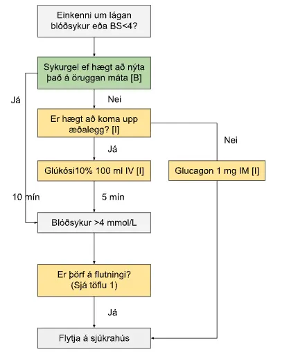 ▸ Blóðsykur mælist lágur (<4 mmol/L) fyrir meðferð.