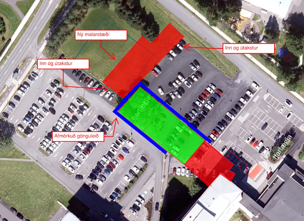 Vegna jarðvegsframkvæmda NLSH fyrir nýja matsdeild við bráðamóttöku Landspítala lengist gönguleiðin á milli almennu bílastæðanna og bílastæða við bráðamóttökuna (sjá bláa merkingu á mynd).