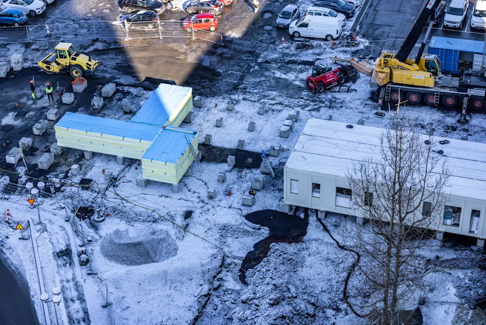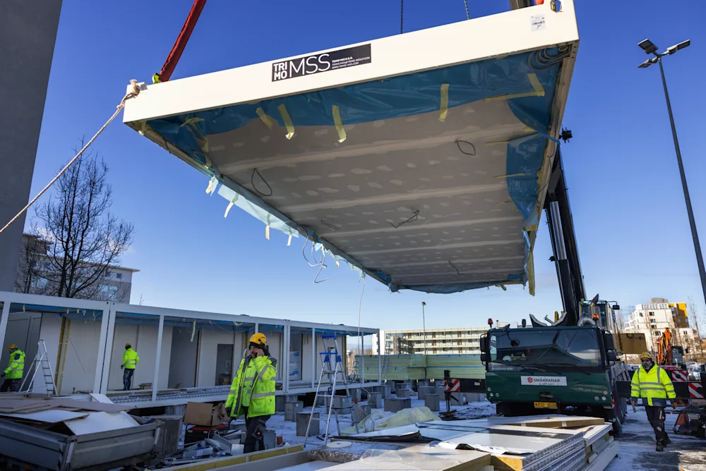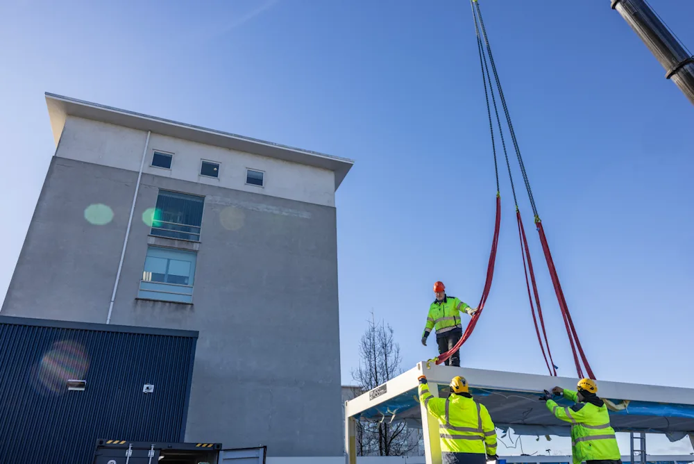 Unnið er að uppsetningu eininga og þegar ytri skel hússins er kláruð verður hafist handa innanhúss. Bráðamatsdeildin verður viðbót við bráðaþjónustu Landspítala og er ætlað að dreifa álagi þannig að betur verði hægt að ráða við vaxandi verkefni.