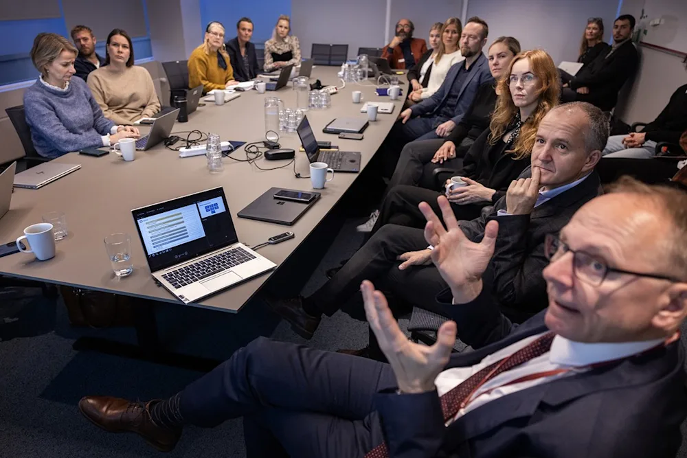 Á myndinni má sjá Runólf Pálsson forstjóra kynna stjórnskipulag Landspítala og helstu áskoranir sem eru sameiginlegar í heilbrigðisgeiranum á Norðurlöndunum, sem og víðar.