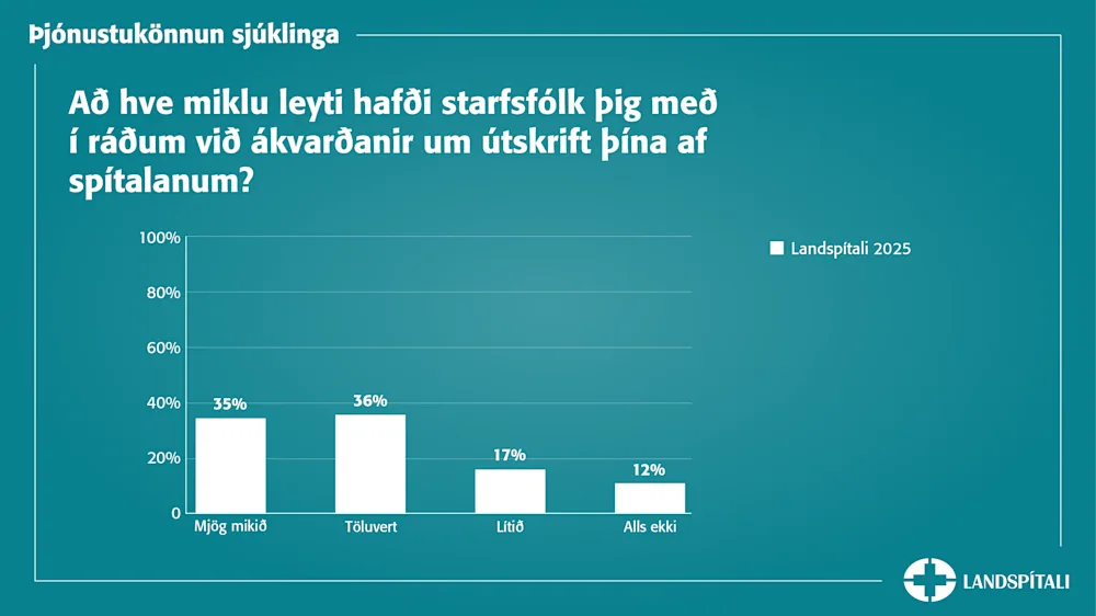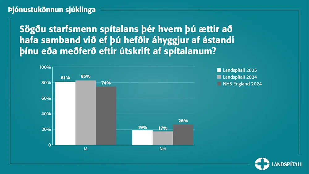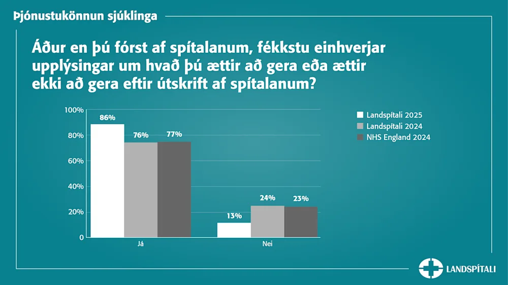 Nær öllum sjúklingum fannst þeim hafa verið sýnd umhyggja á spítalanum auk þess sem flestum fannst upplýsingagjöfin góð: 87% sjúklinga fannst þeir hafa fengið upplýsingar um hvað þeir ættu eða ættu ekki að gera eftir útskrift og 81% sagðist hafa verið upplýst um við hvern þeir ættu að hafa samband ef þeir hefðu áhyggjur af ástandi sínu eða meðferð eftir útskrift.