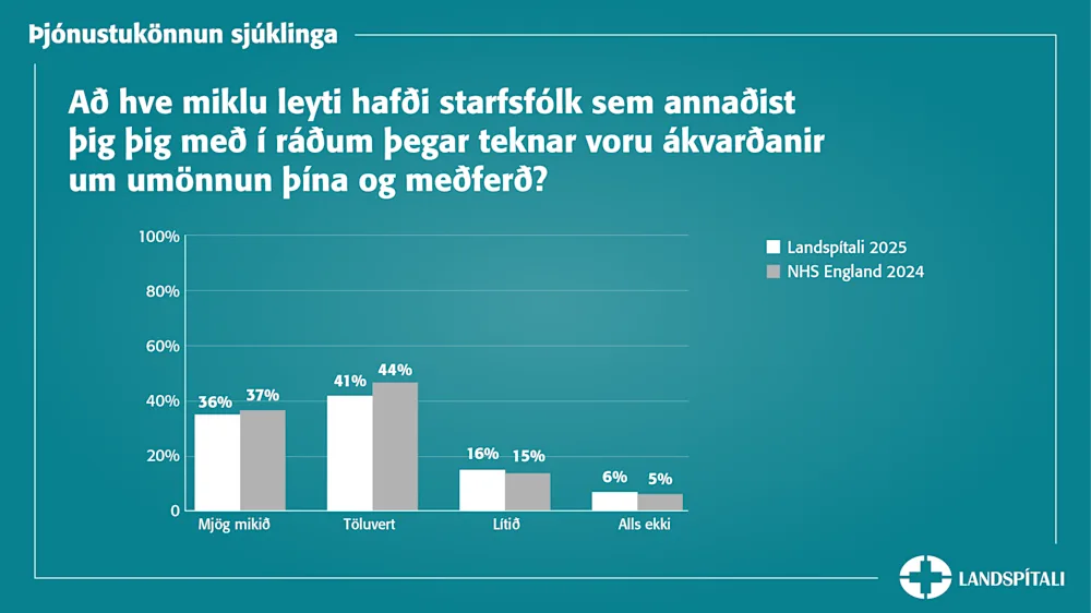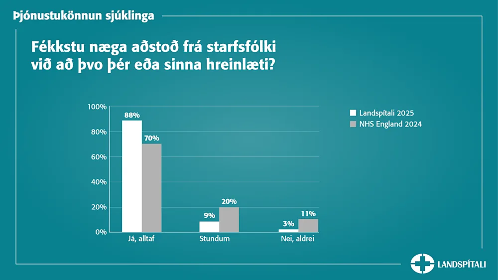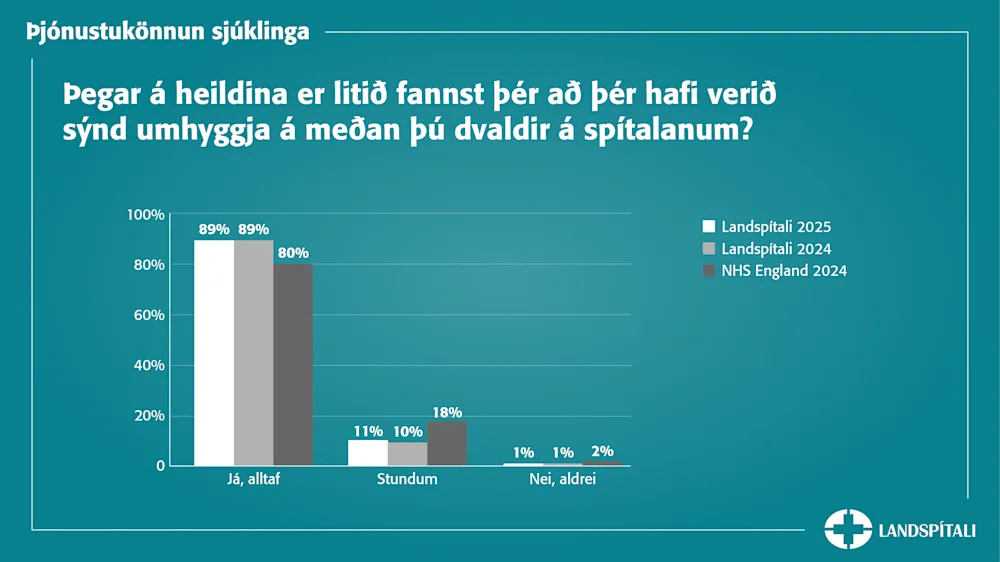 Starfsfólk Landspítala leggur sig fram um að koma fram við sjúklinga af virðingu og endurspeglast það í nýjustu þjónustukönnun sjúklinga. Þar svara 99% sjúklinga því til að komið hafi verið fram við þá af virðingu á meðan dvalið var á spítalanum, þar af sögðu flestir að framkoma starfsfólks hefði ávallt einkennst af virðingu.