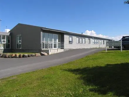 Inngangurinn er fyrsta hurð á suðurhlið hússins, ekki hurðin sem snýr að bílastæðinu.
