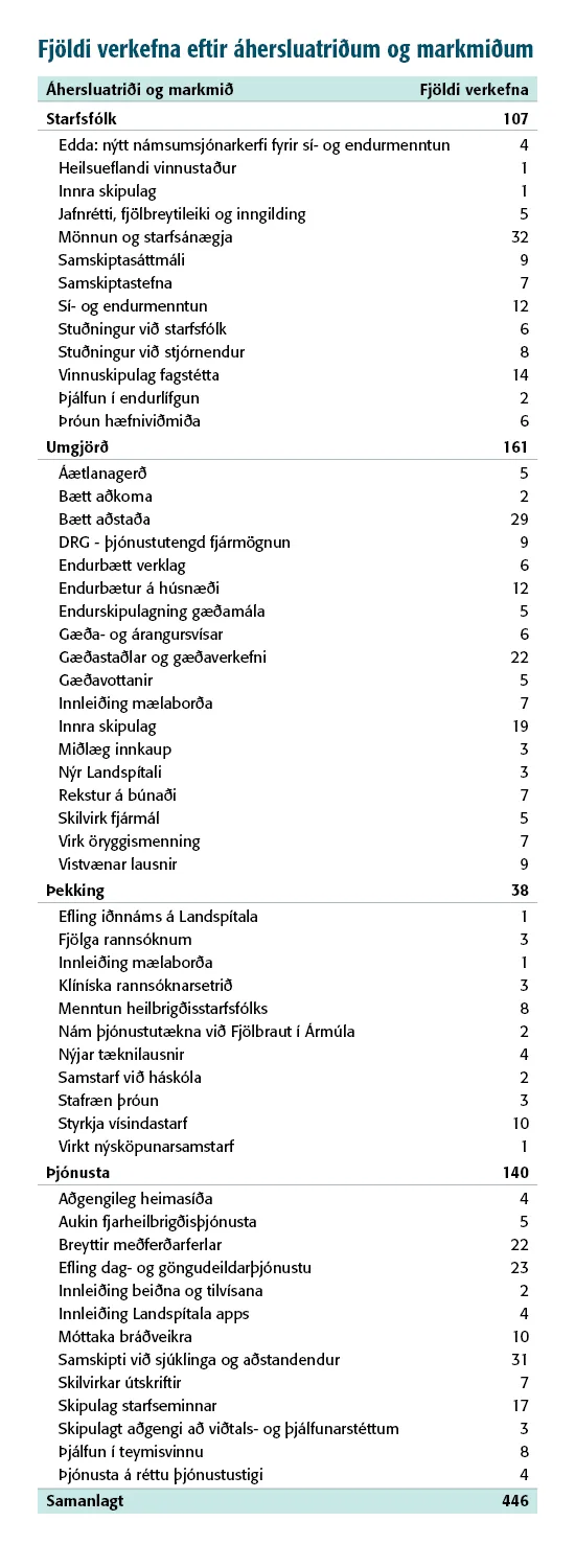 Starfsáætlun Landspítala áætlar að ljúka um 450 verkefnum sem miða að 50 markmiðum, flestum á árinu 2024. Sum verkefni eru hluti af langtímaverkefnum til að bæta þjónustu, auka skilvirkni og tryggja bestu mögulegu meðferð.