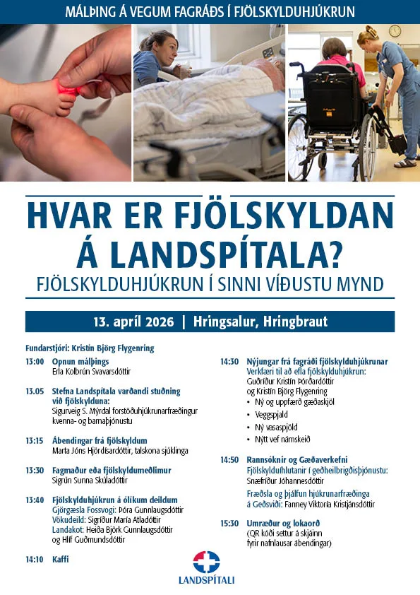 13:40 - Fjölskylduhjúkrun á ólíkum deildum. Þóra Gunnlaugsdóttir (gjörgæsla Fossvogi), Sigríður María Atladóttir (Vökudeild), Heiða Björk Gunnlaugsdóttir (Landakot) og Hlíf Guðmundsdóttir