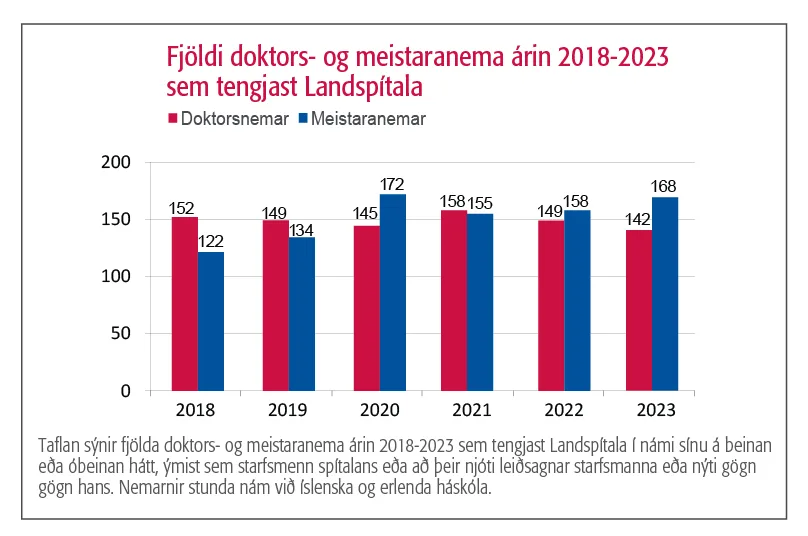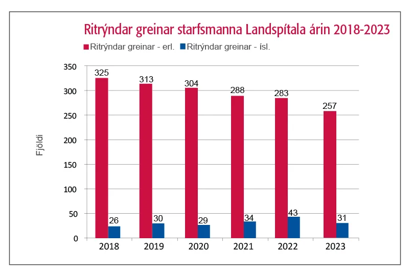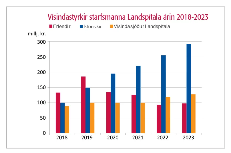 Á árinu 2023 var engin lognmolla á Landspítala frekar en fyrri ár og verkefnin óþrjótandi. Árið 2023 var næstsíðasta ár núgildandi vísindastefnu spítalans, sem tekur til áranna 2019-2024. Eitt meginmarkmið þeirrar stefnu er að auka framlög til vísindastarfsemi til samræmis við það sem er talið eðlilegt á norrænum háskólasjúkrahúsum. Einnig er lögð áhersla á að vísindastarf sé eflt og samofið daglegri starfsemi, jafnframt því sem unnið sé að bættri aðstöðu til vísindastarfa og þróun öflugra rannsóknarhópa. Í stefnunni segir einnig að framlög til vísindastarfsemi nái að lágmarki 3% af veltu á árinu 2024 og að aukning verði á fjölda greina þar sem fyrsti og/eða síðasti höfundur kemur frá Landspítala.