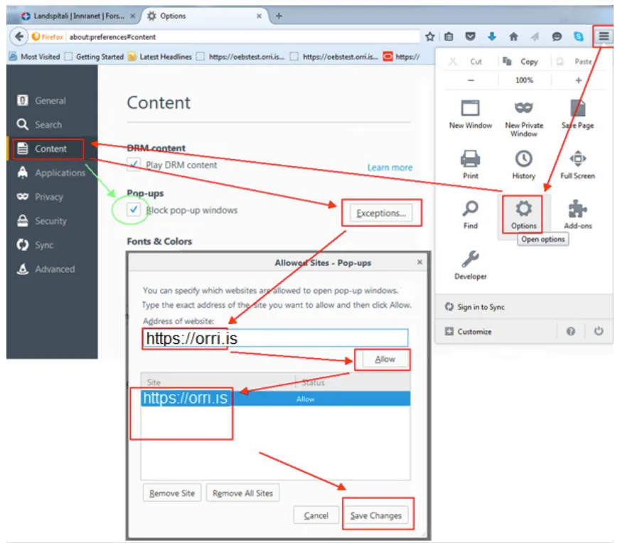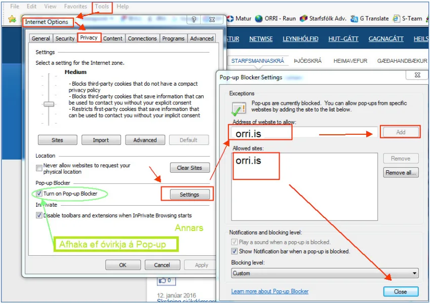 hafa Pop-up blocker-inn virkan er hægt að setja undantekningu í hann. Veljið þá Settings og bætið við eftirfarandi undantekningu: orri.is