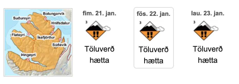 The Icelandic Met Office has announced an uncertainty phase due to a possible risk of avalanches in northern Westfjords. The forecast is for a north-east wind tonight, 10-18 m/sec. Snow showers and frost, 2 to 7 degrees below zero. Disturbances in transportation may be expected and people are required to take a close look at driving conditions before travelling. An uncertainty phase is in effect on the road through Eyrarhlíð and Súðavíkurhlíð.