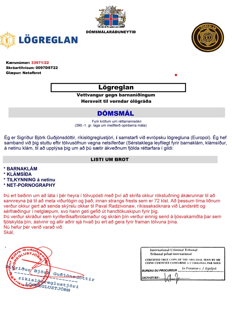 Í tölvupóstinum er talað um dómsmál vegna netbrota og er nafn fyrrverandi ríkislögreglustjóra notað sem sendandi skilaboðanna í nafni ríkislögreglustjóra, lögreglu og dómsmálaráðuneytisins.