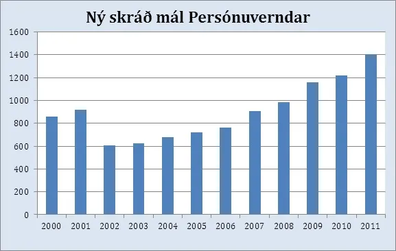 Stöðug aukning hefur orðið í fjölda innkominna erinda hjá Persónuvernd, en á árinu 2011 voru nýskráð mál alls 1397 talsins. Þá voru til afgreiðslu 190 óafgreidd erindi frá fyrra ári. Alls hafði stofnunin því til meðferðar 1587 mál á árinu. Höfðu 1307 mál verið afgreidd við árslok. Til samanburðar voru nýskráð mál á árinu 2010 alls 1207. Það er tæplega 16% (15,74) aukning á milli ára.