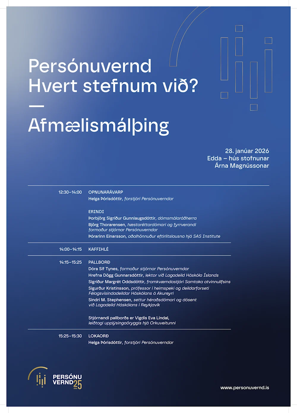 Í tilefni af 25 ára afmæli Persónuverndar býður stofnunin til afmælismálþings sem haldið verður á alþjóðlega persónuverndardaginn, 28. janúar nk., klukkan 12:30. Málþingið verður haldið í Eddu – húsi stofnunar Árna Magnússonar.