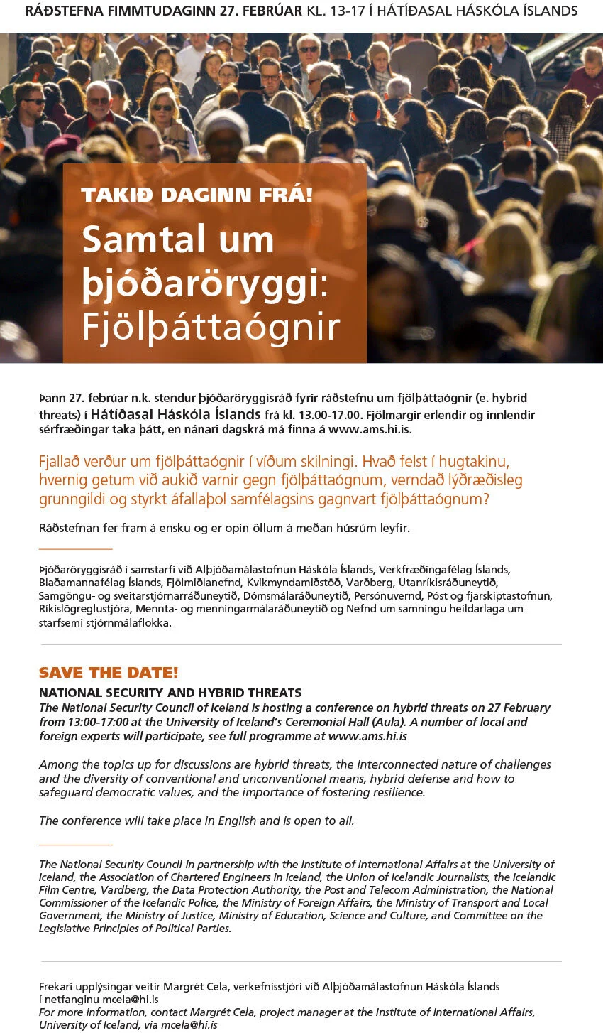 Þann 27. febrúar n.k. stendur þjóðaröryggisráð fyrir ráðstefnu um fjölþáttaógnir (e. hybrid threats) í Hátíðasal Háskóla Íslands frá kl. 13.00 - 17.00