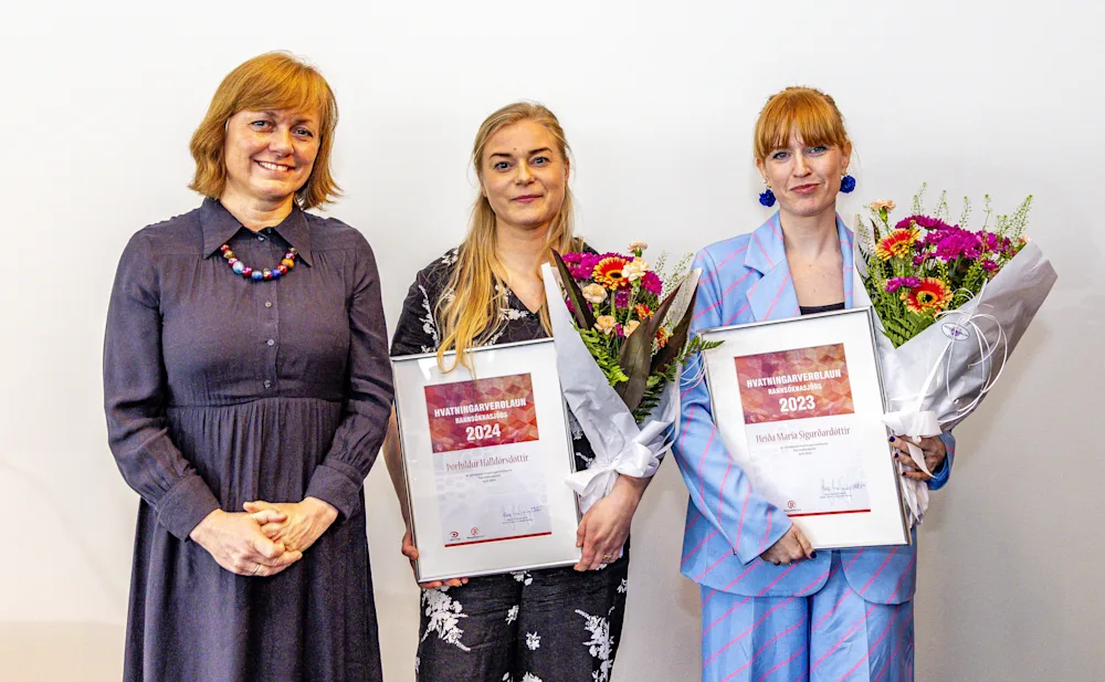 Hvatningarverðlaun Rannsóknasjóðs voru veitt tveimur framúrskarandi vísindakonum á rannsóknaþingi í dag. Dr. Heiða María Sigurðardóttir, prófessor við Sálfræðideild Háskóla Íslands, hlaut verðlaunin fyrir árið 2023 og Þórhildur Halldórsdóttir, lektor við Sálfræðideild Háskólans í Reykjavík, hlaut verðlaunin fyrir árið 2024. Sigríður Valgeirsdóttir, skrifstofustjóri háskóla-, iðnaðar- og nýsköpunarráðuneytis afhenti verðlaunin fyrir hönd ráðherra.