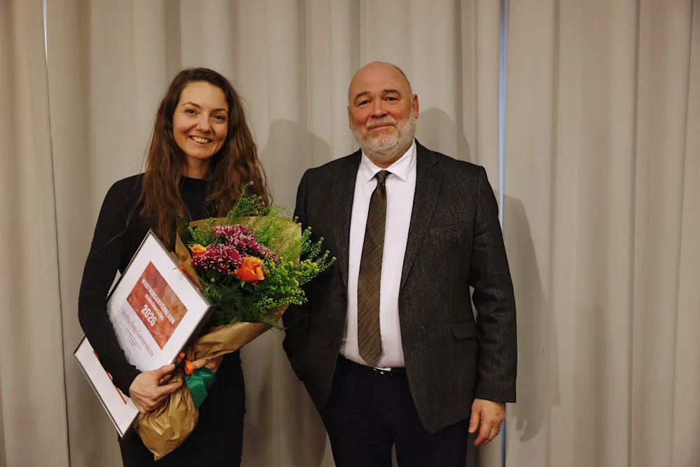 Handhafi Hvatningarverðlauna Rannsóknasjóðs 2026, Dr. Hrefna Dögg Gunnarsdóttir og ráðherra menningar, nýsköpunar- og háskóla Logi Einarsson. Ljósmyndari: Arnaldur Halldórsson
