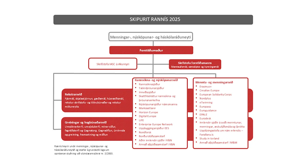 Rannís heyrir undir menningar-, nýsköpunar- og háskólaráðuneytið og starfar á grundvelli laga um opinberan stuðning við vísindarannsóknir nr. 3/2003.