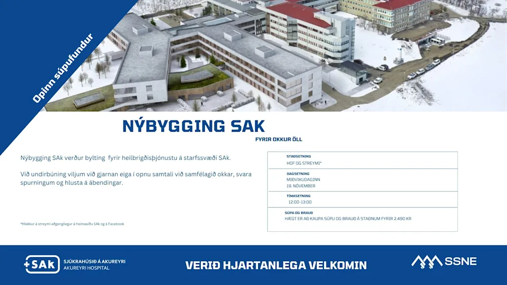 Þann 19. nóvember kl.12-13 fer fram súpufundur í menningarhúsinu Hofi á Akureyri og í streymi um nýbyggingu SAk. Hlekkur á streymið: https://www.youtube.com/live/_xwnyW06pzA