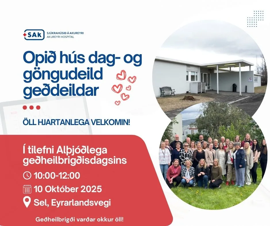 Í tilefni Alþjóðlega geðheilbrigðisdagsins þann 10. Október, á milli kl:10-12, ætlar starfsfólk dag- og göngudeild geðdeildar SAk að opna dyrnar og bjóða gestum að kynna sér starfsemina, tækjabúnað og aðstöðu.