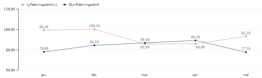 7.482 á sama tíma í fyrra (sjá graf um komur á bráðamóttöku janúar til maí ár hvert). Biðtími eftir því að hitta lækni á bráðamóttöku hefur aukist lítillega og er nú um 45 mínútur sem er aðeins fyrir utan viðmið okkar um 40 mínútna bið eftir lækni.