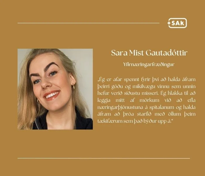 Sara Mist lauk meistaranámi í klínískri næringarfræði frá Háskóla Íslands árið 2024. Hún er starfsfólki og sjúklingum SAk ekki ókunn, þar sem hún hefur starfað hér bæði sem meistaranemi í klínískri næringarfræði og síðar í tímabundnu starfi.