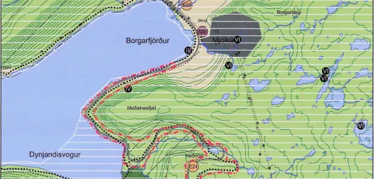 Í breytingunni felst að mörkuð er stefna um nýja veglínu um Dynjandisheiði á um 11 km kafla frá Borgarfirði að sveitarfélagamörkum við Vesturbyggð og skilgreind eru 4 ný efnistökusvæði, E21-E24, á svæðinu.
