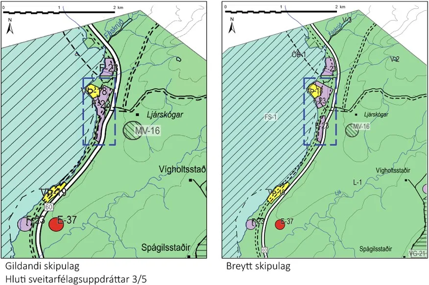 Í breytingunni felst að afmörkun frístundabyggðar F23 er breytt, skiptist í tvö svæði og lengist syðra svæðið til suðurs. Heildarstærð svæðisins minnkar úr 18,2 ha í 17,5 ha og stækkar aðliggjandi landbúnaðarland (L1) til samræmis.