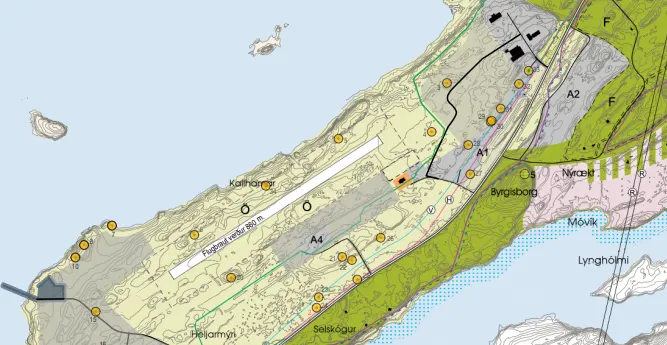 Í breytingunni felst stefna um uppbyggingu græns iðngarðs. Stækka á núverandi athafnasvæði A1, A3 og A4 við Hamraenda og Kallhamar en óbyggð svæði og landbúnaðarsvæði minnka sem því nemur. Út frá A3 er gert ráð fyrir nýju hafnarsvæði H3 ásamt því að flugbraut verður stytt og hindrunarflötur hennar minnkaður.