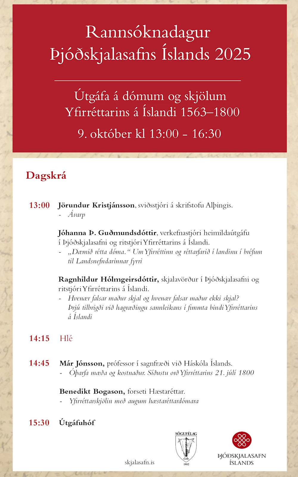 Útgáfa á dómum og skjölum Yfirréttarins á Íslandi 1563–1800. Rannsóknadagur Þjóðskjalasafns og útgáfuhóf 9. október 2025