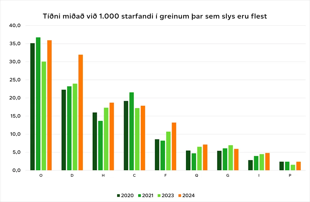 Mynd 4. Tíðni miðað við 1.000 starfandi í greinunum þar sem flest slys verða.