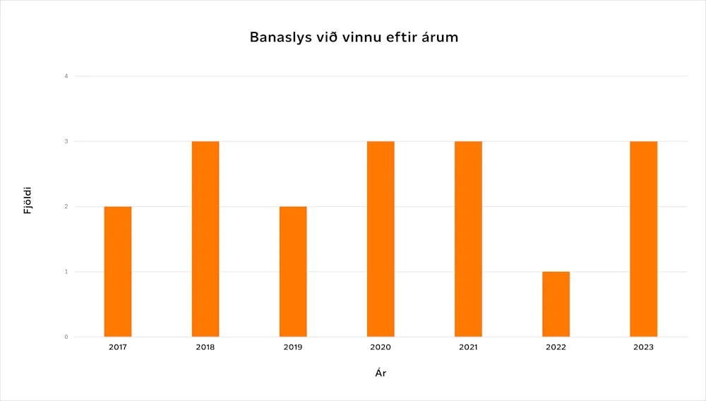 Banaslys við vinnu eru sem betur fer sjaldgæf á Íslandi en þau voru engu að síður þrjú árið 2023 sem er aðeins yfir meðaltali áranna 2017-2023 sem er 2,4 slys á ári. Banaslysin urðu við störf í landbúnaði og smásölu. Ekkert banaslys varð við mannvirkjagerð árið 2023 en þau eru að öllu jöfnu flest í mannvirkjagerð, eða um helmingur alla banaslysa á árunum 2017-2023.