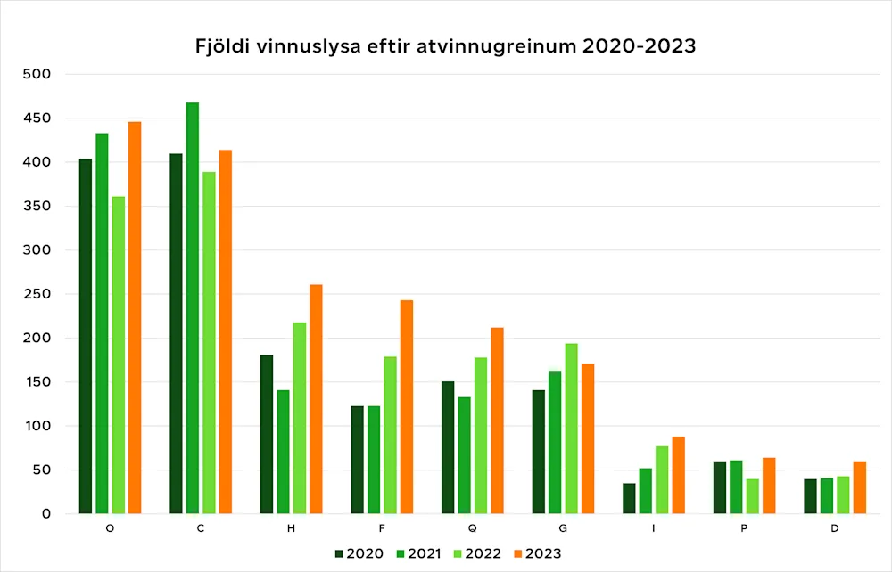 Vinnuslys árið 2023 voru flest í opinberri stjórnsýslu en hér undir fellur meðal annars löggæsla. Næst flest voru slys í framleiðslu en undir hana falla fiskvinnsla, matvælaiðnaður og stóriðja. Slysum fækkar heldur í framleiðslu en fjölgar heldur í opinberri stjórnsýslu. Í nokkrum greinum fjölgar slysum eða í mannvirkjagerð, flutningi og geymslu og rekstri veitinga- og gististaða sem má væntanlega rekja til aukinna umsvifa í þessum greinum. Jafnframt fjölgar slysum í heilbrigðis- og félagsþjónustu.