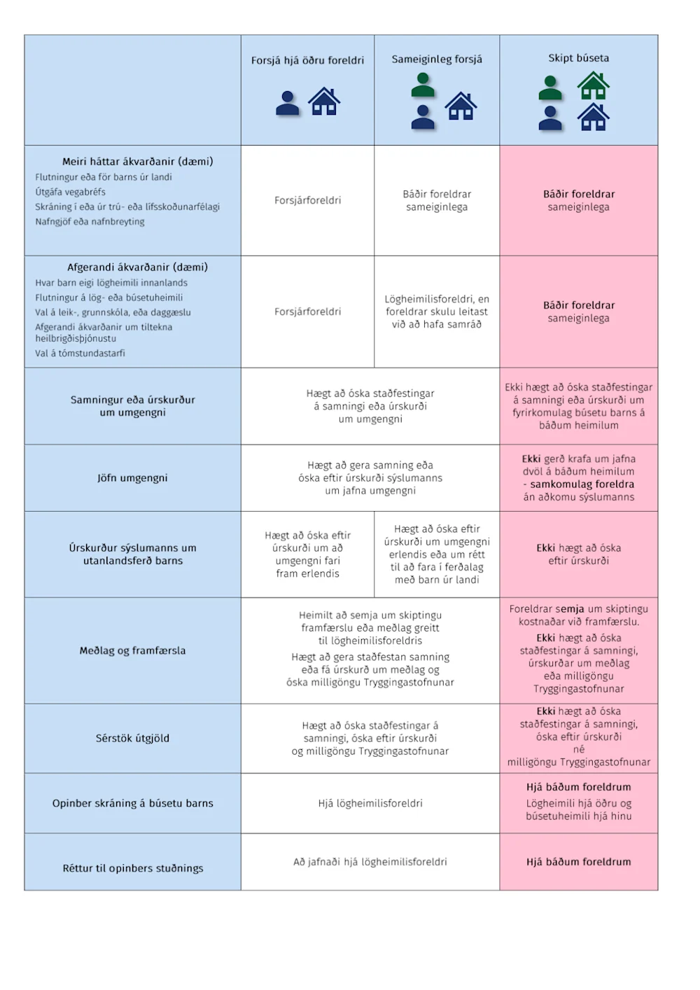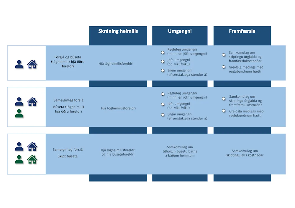 Lög sem heimila skipta búsetu barns tóku gildi 1. janúar 2022. Markmið laganna er að stuðla að sátt og jafnari stöðu foreldra sem fara sameiginlega með forsjá barns og ákveða að ala það upp saman á tveimur heimilum. Samningur um skipta búsetu skal ávallt taka mið af því sem best hentar hag og þörfum barnsins.
